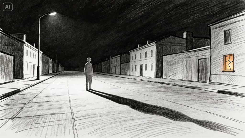 Cinematic suspense thriller film still, empty suburban street at night, a lone man walking under dim streetlights, then freezing in place as he notices a light turning on inside his house in the distance, implying someone is already inside. Cold night atmosphere, deep shadows, wet asphalt reflecting the streetlights, quiet neighborhood, subtle fog, realistic cinematic lighting, tension-filled composition, dramatic framing, ultra detailed, photorealistic, 35mm cinematic lens, eerie mood, high-end film photography.